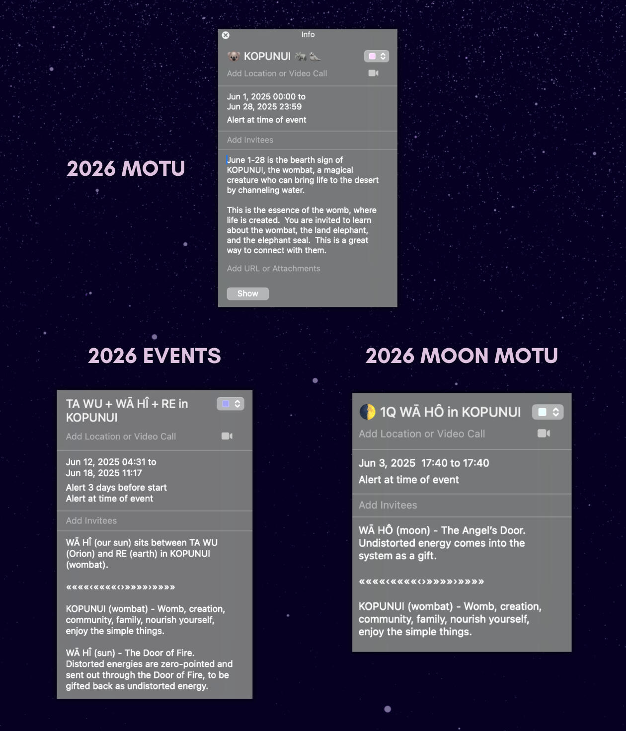 The Lemurian New Year is June 1st, which means we're now in 2026. This calendar includes 5 ics files. It includes everything from last year's calendar, and has an additional file called LIGHT OF FATHER.Everything is programmed to First Light (New Zealand), and automatically syncs to your time zone.It also includes descriptions of the MOTU (bearth signs), and teaches the Lemurian names of planets and star constellations throughout the year.And if you're not the digital person, there's a print at home version that includes everything from the digital calendar.