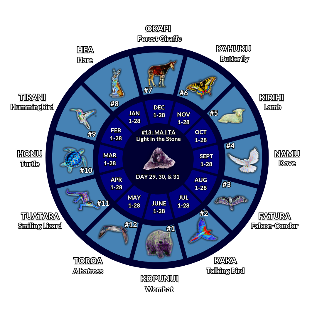 The MOTU are the Lemurian bearth signs, remembered through ancestral memory by the late Māori Elder & tohunga HUNA MAUTA KUMARA TAKI. We do not call them zodiacs because that word does not exist in the Lemurian language. There is only 1 bearth sign per month, in a 28 day per month system, totaling 13 months.Each of the 12 MOTU sitting around the circle are aligned to a land mass on the planet, and have two star constellations aligned to them called MOTU KAWA. This gives us a total of 24 star constellations.The 13th month does have a bearth sign. Anyone born on these days are in MA I TA and they have a choice of bearth sign: either they choose MA I TA (aka the crystal sweet potato), or they go to the sign in the following month.Ex.: Someone born on March 31st can choose MA I TA, or the sign for April, which is TUATARA.
